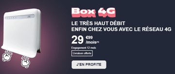 Vous pouvez profiter de la box 4G NRJ à seulement 29,99€/mois, et vous avez 30 jours pour la tester grâce à l'offre "satisfait ou remboursé". Cette box offre 250Go de navigation internet grâce au réseau 4G, avec un débit jusqu'à 10 fois plus rapide qu'en ADSL. L'installation est simple et rapide. Dès réception de votre box 4G, vous n'aurez qu'à la brancher pour en profiter !