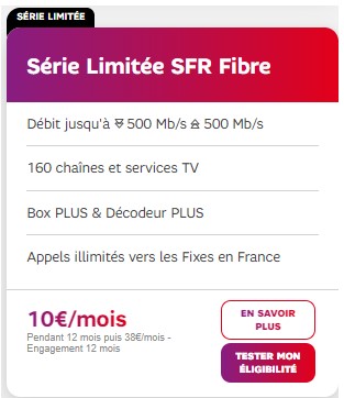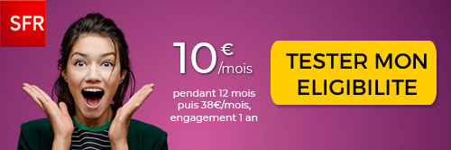 Vous souhaitez profiter d'une box internet mais votre budget est serré ? SFR vous propose de vous connecter pour seulement 10€/mois ! Selon votre éligibilité vous pourrez soit profiter de la box SFR via l'ADSL, soit via la Fibre optique. Dans les deux cas, le prix est valable pendant 12 mois avant de passer à 33€/mois pour l'ADSL et 38€/mois pour la Fibre. Cette promo box internet est soumise à un engagement de 12 mois à la fin duquel vous pourrez résilier si vous ne souhaitez pas payer votre box plus chère.