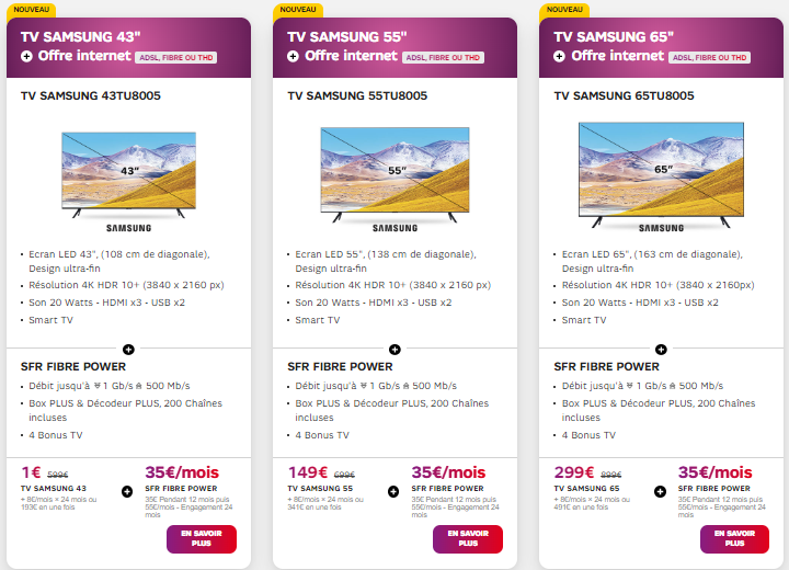 Le fournisseur SFR nous a tous surpris avec sa nouvelle offre TV+ Box internet. Cette offre est parfaite pour tout type de consommateur puisqu'elle est configurable. Elle propose des formats de télévision Samsung divers. Les modèles de télévision Samsung proposés sont les suivants: TV 43 pouces, TV 55 pouces et TV 65 pouces. Le modèle de télévision dernier cri proposé permet au client de profiter des couleurs vives de l'écran, les images sont éclatantes et réalistes grâce au crystal UHD. SFR vous laisse l'option de payer en une fois ou en 24 fois sans frais. En choisissant le paiement en 24 fois, sur votre première facture un apport initial sera facturé, le prix de la télévision sera complété au bout de 24 mensualités.