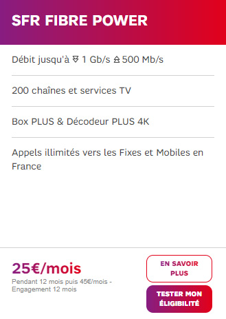 SFR se défend aussi avec sa box internet Power disponible via l'ADSL ou la fibre optique selon votre éligibilité. Vous pouvez en bénéficier pour 25€/mois pour la fibre ou 23€/mois pour l'ADSL pendant les 12 premiers mois et un engagement d'un an. Ensuite les box internet SFR passeront à 40€/mois pour la version ADSL et 45€/mois pour la version Fibre.