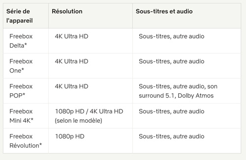 Est-ce que ce sera la dernière fuite avant le lancement de la nouvelle Freebox tant attendue ? Il y a quelques jours Netflix a modifié ses pages d'aides et son tableau récapitulant les différentes Freebox qui prennent en charge la plateforme de streaming. Grâce à Jérôme Derozard, @derozard sur twitter, nous avons une capture d'écran dudit tableau qui a depuis disparu :
