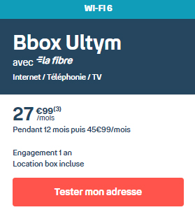 La Bbox Ultym Fibre Optique de Bouygues Télécom est maintenant au prix de 27,99€ par mois durant un an, et à l'issue de cette période de promotion, le prix passera à 45,99€. Cette box haut de gamme est soumise à un an d'engagement minimum, et inclut divers avantages en plus des services classiques internet que nous avons l'habitude de voir. Côté Télévision, la box internet Bouygues offre 180 chaînes, un décodeur 4K et un enregistreur d'une capacité de 128Go.