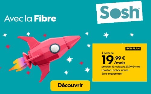 En passant chez Sosh, votre box internet fibre optique vous reviendra à 19,99 €/mois pendant un an (29,99 €/mois ensuite). Cette offre étant sans engagement, vous ne prendrez aucun risque en vous abonnant. Si vous n’êtes pas convaincu, vous pourrez résilier immédiatement.