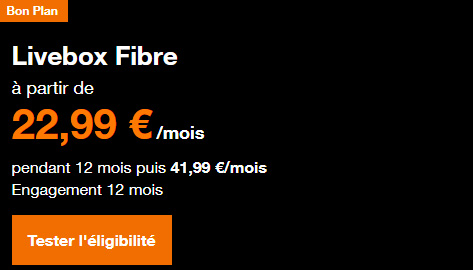 La première box proposée est affichée au prix de 22,99€ par mois pendant une année entière avant de passer à 41,99€ par mois. Grâce à celle-ci, vous bénéficierez de la Fibre jusqu'à 400Mbit/s en téléchargement et 400Mbit/s en envoi. Pour vous, Orange vous offre le raccordement de la Fibre. L'accès à plus de 150 chaînes TV sera compris dans votre abonnement. Les appels depuis le fixe vers les fixes seront disponibles en illimité.