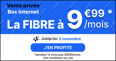 C'est la bonne affaire box du moment. Nous vous proposons en exclusivité et jusqu'au 2 novembre une vente privée box internet disponible avec la fibre optique ou l'ADSL selon votre éligibilité. Vous pouvez en profiter pour seulement 9,99€/mois pendant un an puis 28,99€ pour la fibre et 25,99€ pour l'ADSL. Cette offre est soumise à un engagement d'un an à la fin duquel vous serez libre de résilier pour ne pas payer plus cher.
