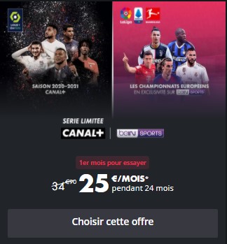 Contrairement aux autres promos, ici vous pourrez profiter des matchs via les applications mais aussi directement depuis votre télévision. Le prix est de 25€/mois au lieu de 34,90€/mois avec un engagement de 24 mois. Si vous n'êtes pas sûrs de vous, CANAL+ vous propose le premier mois pour essayer.