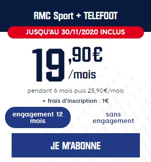 C'est une belle promotion que vous propose la célèbre chaîne RMC Sport. En effet, celle-ci vous offre de profiter en plus de la nouvelle chaîne TELEFOOT dans un pack en promotion jusqu'au 30 novembre inclus. Cette offre vous permettra donc de profiter de RMC SPORT et TELEFOOT pour 19,90€/mois pendant 6 mois puis 25,90€/mois. Les frais d'inscription sont de 1€ et l'offre est soumise à un engagement de douze mois.