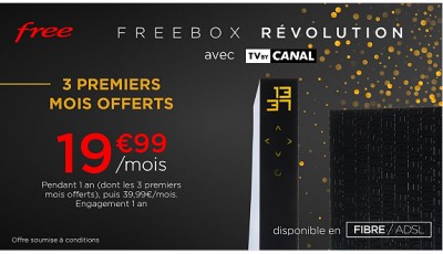Grosse promotion sur la Freebox Révolution avec TV by Canal en vente privée sur le site Veepee qui se trouve proposée à moitié prix ! L’abonnement triplepay se trouve donc au prix canon de 19,99€ par moispendant un an, au lieu de 39,99€. Mais ce n’est pas tout, car en prime Free vous offre les trois premiers mois !