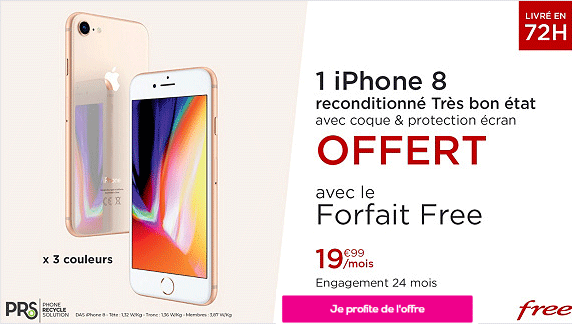 La seconde vente privée disponible jusqu'au vendredi 4 juin 6h concerne le mobile. Dans le cadre de cette opération, Free offre un iPhone 8 reconditionné en très bon état pour toute commande d'un forfait Free 150Go à 19.99€ par mois avec un engagement de 24 mois. Le Smartphone offert est disponible en coloris Or/Gris sidéral/Rouge et en version 64 Go avec deux accessoires offerts (coque et protection écran).