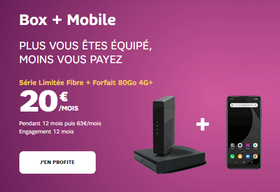 En souscrivant à la série limitée Fibre proposée par SFR, vous aurez le droit à une superbe remise sur le forfait mobile de votre choix. Si vous optez pour l’offre 80 Go 4G+ de l’opérateur au carré rouge, celle-ci vous sera facturée à moitié prix tout au long de la première année. Normalement commercialisé au prix mensuel de 20 €, l’abonnement ne vous coûtera donc que 10 € par mois pendant un an (25 € ensuite).