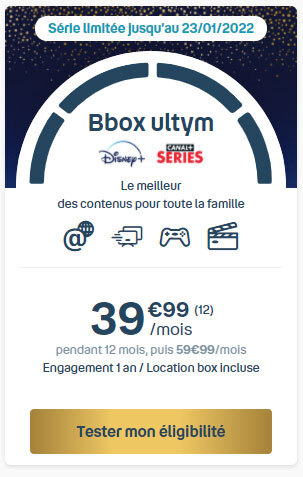 Jusqu’au 23 janvier 2022, Bouygues Telecom propose sa box premium Bbox Ultym en série limitée pour 39,99 € par mois la première année (59,99 € avec la Fibre ou 54,99 € avec l’ADSL par la suite). Soumise à un an d’engagement, cette offre canon comprend Internet à toute vitesse (débit maximum de 2 Gb/s en descendant et 600 Mb/s en montant avec la fibre optique), ainsi que les appels à volonté vers les fixes de plus de 110 territoires + les mobiles de France, d’Europe, de Suisse, du Canada, des USA, de Chine, de Corée du Sud et de Singapour.