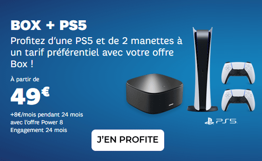 L’obtention de la PS5 à 49 € est conditionnée à un abonnement internet auprès de SFR. La box fibre Power de SFR vous reviendra à seulement 34 € par mois pendant un an (53 € par la suite).