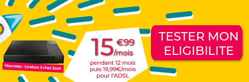 Avec son offre internet fibre, SOSH propose l'une de meilleures affaires du moment pour passer à la vitesse supérieure sans engagement et à petit prix. Son offre Boîte SOSH est effectivement proposée à moitié prix et ce pour une période de 12 mois. Jusqu'au 26 septembre 08h, cette offre internet pas chère vous est offerte au tarif mini de 14,99 €/mois pendant 12 mois, après quoi vous repasserez sur le prix standard de 29,99 €/mois. Si la Fibre Orange n'est pas disponible dans votre logement, SOSH met à disposition l'ADSL au même prix la première année à savoir 14.99€ puis 19.99€ par mois.