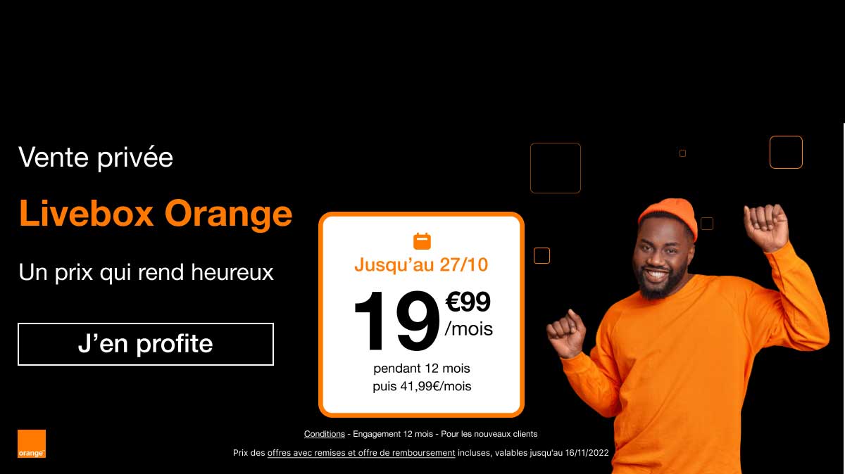 Jusqu’au 27 octobre 2022, vous avez accès à une incroyable vente privée Bemove avec la Livebox Orange. Durant cette opération promotionnelle, vous pouvez accéder à l’offre internet d’Orange pour seulement 19,99 € par mois pendant un an dans le cadre d'un changement de fournisseur d'accès à Internet. En saisissant cette superbe occasion, vous économiserez 3 € par rapport à la réduction actuellement proposée sur le site web d’Orange (22,99 € par mois). Bien sûr, ce bon plan est valable pour les versions Fibre et ADSL de la Livebox. L’unique condition pour en profiter est de ne pas encore être abonné à une box chez l’opérateur ou chez Sosh.
