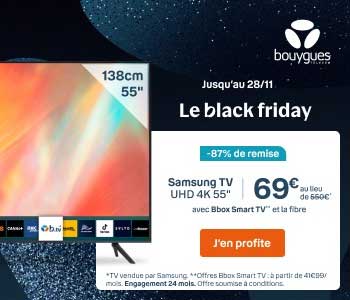 À l’occasion du Black Friday 2022, Bouygues Telecom organise une opération promo exceptionnelle avec ses offres Bbox Smart TV. L’opérateur a effectivement décidé de proposer la Smart TV Samsung UHD 4K 138 cm (55 pouces) à seulement 69 €. Normalement, ce modèle de télévision connectée coûte 550 €. La réduction s’élève donc à 481 €, soit 87 % de remise immédiate. Comment profiter de ce prix cassé ? Simplement en souscrivant un abonnement Bbox Must ou Bbox Ultym avec la Fibre !