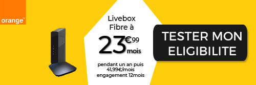 Si vous êtes à l'affût d'une box internet sur le réseau Orange, voilà une bonne affaire que l'on vous recommande vivement. Rendez-vous vite chez Orange pour profiter de cette promotion. Jusqu'au 05 avril, la livebox Fibre vous est proposée au prix fabuleux de 23,99 €/mois pendant 12 mois, puis à 41,99 €/mois.