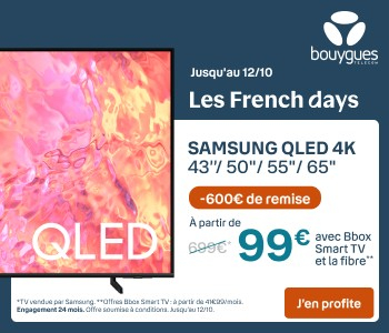Parmi les bons plans à saisir chez Bouygues Telecom lors des French Days, il y a des réductions de choc sur plusieurs modèles de Smart TV Samsung QLED 4K. En effet, à l’occasion de la grande opération promotionnelle de ce début d’automne et dans le cadre des abonnements Bbox Smart TV avec la Fibre, l’opérateur vous propose d’acquérir ce type de téléviseur avec une remise hallucinante de 600 €. Concrètement, vous pouvez vous offrir :