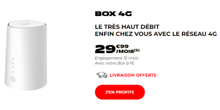Cette box Internet est proposée avec engagement 12 mois au prix fixe de 29,99 €/mois (+ 1 € lors de la souscription pour la mise à dispositif de l'appareil). Vous disposez de 30 jours pour tester : si vous n'êtes pas satisfait(e), votre abonnement est résiliable sans frais !