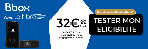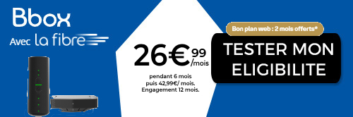 Elle comprend également la téléphonie illimitée vers les fixes et mobiles en France métropolitaine ainsi que vers les fixes d'une centaine de pays. Autre point fort de cette excellente box Internet : son bouquet TV intégrant plus de 180 chaînes TV accessibles via le décodeur TV Bbox 4K, également enregistreur (jusqu'à 100 heures de programmes). En prime, Bouygues Télécom vous offre Universal+ et Prime Vidéo pendant 6 mois. Au-delà, ces options vous seront facturées respectivement 5,99 € et 6,99 € par mois (mais pas de panique, elles sont résiliables sans frais à tout moment !)