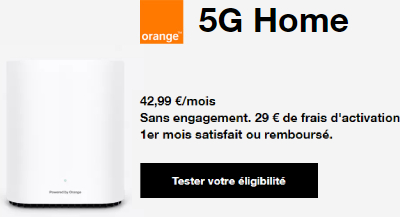 Également sans engagement, la Box 5G d'Orange (intitulée "5G Home") est affichée au prix fixe de 42,99 € mensuels (+ 29 € de frais d'activation). Le 1er mois est garanti satisfait ou remboursé.