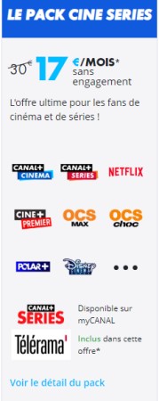 Bon à savoir, le pack Ciné Séries comprenant les chaînes Canal+ Cinéma, Séries, Premier, Netflix, OCS Max, OCS choc...est proposé actuellement au prix de 17€ par mois au lieu de 30€ sans engagement.