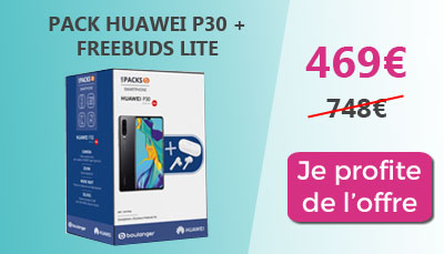 Boulanger propose deux autres promos Huawei très intéressantes, elles concernent les Huawei P30 et P30 Lite. Le Huawei P30 128Go est proposé en pack avec les Freebuds Lite à 469€ au lieu de 748€, soit une remise 279€ ! Cette version de la gamme P30 est la version originale. Elle propose un stockage interne de 128Go et une RAM de 4Go. Son triple capteur photo arrière offre des résolutions de 48Mpx,16Mpx et 8Mpx.