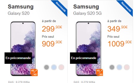 Les nouveaux Smartphones du constructeur Samsung sont disponibles en précommande chez les opérateurs mobiles ainsi que chez la plupart des enseignes. Le Samsung Galaxy S20 4G en 128Go est affiché à 909€ sans abonnement et la version 5G à 1009€.
