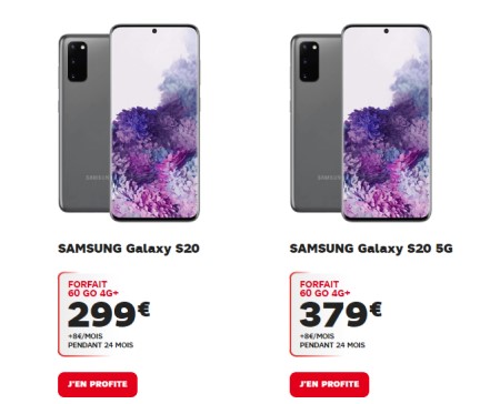 - Le Samsung Galaxy S20 5G à 379€ + 8€ par mois (24mois) avec le forfait SFR 60Go ou 471€ avec le plus gros abonnement 100Go de l'opérateur