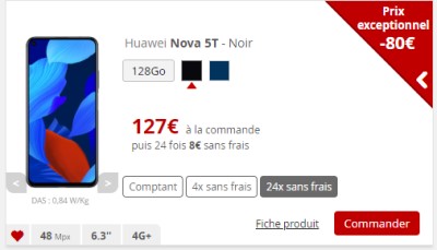 Enfin, pour les plus petits budgets, Free met en avant le Huawei Nova 5T. Ce modèle sorti en octobre 2019 est remisé de 70€ dans la boutique en ligne du quatrième opérateur. Grâce à la remise de 70€, ce Smartphone Chinois passe au prix de 309€. Pour ce modèle, Free propose trois modes de paiement, en une fois, en 4 fois ou encore en 24 fois sans frais.