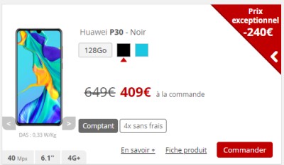 Free Mobile propose un rabais exceptionnel pour l'achat d'un Huawei P30 avec la commande d'un forfait sans engagement de l'opérateur. Ce Smartphone phare du constructeur passe en effet au prix de 409€ au lieu de 649€ soit une belle économie de 240€. Deux modes de paiement sont proposés, vous pouvez soit le payer au comptant ou encore en 4 fois sans frais avec un premier versement de 103€ à la commande suivi de 3 mensualités de 102€. Les abonnés Free Mobile existants ont aussi la possibilité de profiter de ce bon plan en passant via l'espace client.