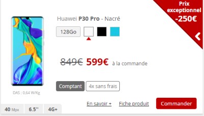 Autre promo intéressante, le Huawei P30 Pro remisé de 250€ avec un forfait Free. Ce modèle haut de gamme du constructeur passe ainsi au prix canon de 599€ au lieu de 849€. Pour le paiement, sachez qu'il est aussi possible de choisir le mode de paiement en 4 fois sans frais avec une première mensualité de 152€ à la commande puis 3 fois 149€.