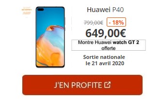 Les nouveaux Huawei P40 et P40 Pro sont en précommande chez les marchands et opérateurs mobiles. Pour accompagner le lancement du P40, le constructeur offre jusqu'au 20 avril une montre connectée Huawei Watch Gt 2 d'une valeur de 229€. Cette offre est valable sur demande pour y participer, vous devez :