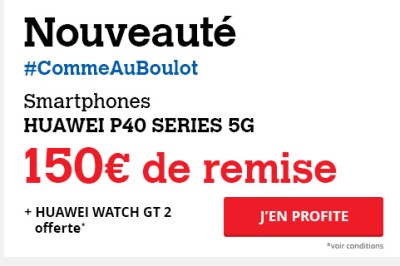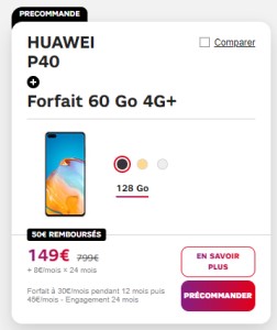 Autre possibilité, vous pouvez associer le Huawei P40 à un forfait SFR 60Go en promo à 30€ par mois pendant 12 mois et bénéficier d'une ODR de 50€. En optant pour ce type de solution, le P40 revient à 149€ puis 8€ par mois pendant 24 mois.