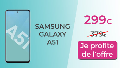 Le Samsung Galaxy A51 à peine sorti, est en promo pour un prix imbattable chez Boulanger. Ce smartphone est idéal si vous êtes à la recherche d'un smartphone qui offre de performances optimales avec un bon appareil photo. Le Samsung Galaxy A51 est proposé à 299€ au lieu de 379€, ce qui vous fait une remise de 21%. Le Galaxy A51 est équipé d'un écran large de 6,5 pouces soit 16,5 cm d'une bonne résolution et est compatible avec la charge rapide. Il est disponible en plusieurs couleurs: noir, blanc et bleu.