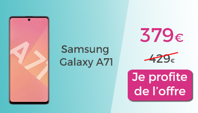 Avant de sortir sa nouvelle gamme Galaxy S20 qui connaît un franc succès, Samsung a lancé un smartphone milieu de gamme à moins de 500€ : le Galaxy A71. Ce smartphone bénéficie en ce moment d'une opération commerciale. Vous pouvez effectivement profiter d'un remboursement différé de 50€ si vous acheter ce téléphone avant le 31 Juillet. Vous profiterez alors du Samsung Galaxy A71 à seulement 379€ au lieu de 429€.