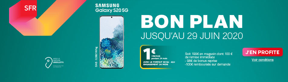 Le Galaxy S20 est couplé avec le forfait illimité 60 Go de SFR, comme dit précédemment, celui-ci est disponible avec une option Bonus. Néanmoins, vous avez la liberté d'opter ce forfait sans l'option bonus. Vous pourrez ainsi acheter le téléphone à partir de 909€, au lieu d'avoir un engagement de 2 ans, il sera de 12 mois. Vous bénéficierez des mensualités à des prix plus avantageux puisqu'elles seront affichées à 20€ pendant un an puis 35€ au delà. Pour les clients box, la facture mensuelle sera de 10€ par mois pendant 12 mois puis 25€ par la suite.