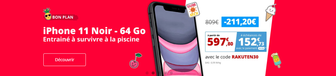 Profitez d'une remise de 22% en plus de 30€ offerts par Rakuten pour l'achat de l'iPhone 11 ! Le code à utiliser pour bénéficier des 30 euros offerts est le suivant : RAKUTEN30. Pour en profiter? Rien de plus simple ! Lors de la commande, vous pourrez taper le code dans la barre qui y sera dédiée.