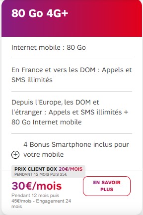 Pour profité de ce tarif avantageux, SFR lie cette offre à un forfait mobile avec engagement de 24 mois. Vous devrez souscrire en même temps au forfait 80Go proposé à 30€/mois pendant 12 mois puis 45€/mois. Si vous êtes abonnés SFR Box, vous pourrez profiter d'une réduction mensuelle de 10€ sur toute la durée de votre abonnement.