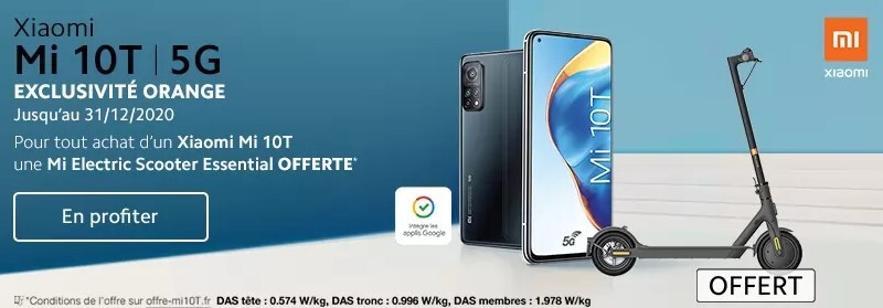Vous voulez obtenir votre trottinette électrique Mi Electric Scooter Essential en cadeau ? Dans ce cas, vous devez acheter le Xiaomi Mi 10T 5G. Pour cela, vous pouvez vous rendre chez Orange. Le smartphone de la marque chinoise y est affiché à 499,90 €. Si vous souhaitez faire baisser la facture, vous avez la possibilité de souscrire à un forfait compatible 5G avec engagement de deux ans. Dans le cadre des offres 150 Go et Go illimités actuellement en promo, le mobile ne vous coûtera notamment que 1 €.