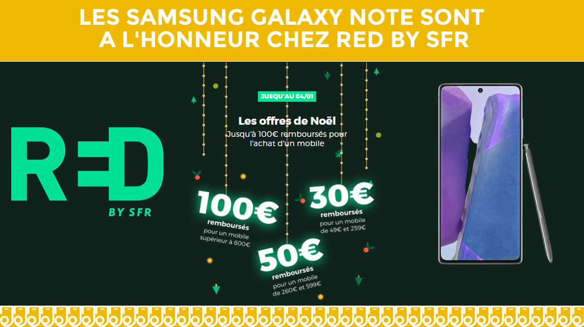 Envie d'un smartphone complet mais à plus petit prix ? RED by SFR pense à tout et propose un second bon plan Samsung Note 10 Lite à 409€ au lieu de 459€, payable en 4 fois si vous le souhaitez ! Une remise de 50€ en remboursement différé sur facture est en effet proposé là aussi jusqu'au 4 janvier 2021.