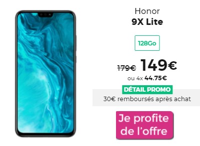 Le Honor 9x Lite est en promo à 149€ au lieu de 179€. RED by SFR vous permet en effet d'économiser 30€ pour l'achat de ce téléphone nu ou avec un forfait RED sans engagement dès 5€ par mois.