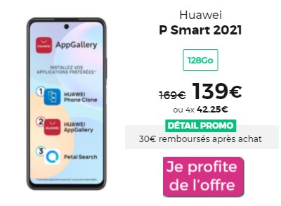 Autre promo intéressante pour s'équiper d'un Smartphone à moins de 150€, le Huawei P Smart 2021. Ce modèle en vente depuis octobre 2020 est remisé de 30€, il passe ainsi à seulement 139€ au lieu de 169€ nu ou accompagné d'un forfait mobile RED sans engagement dès 5€ par mois.