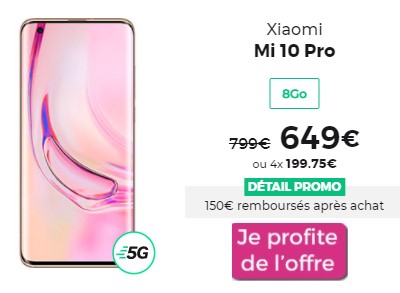 Le Xiaomi Mi 10 Pro est lui aussi en promo à 649€ au lieu de 799€ nu ou associé à un forfait sans engagement. En optant pour le paiement en 4 fois, les mensualités seront de 199.75€ sans compter les remises différées.