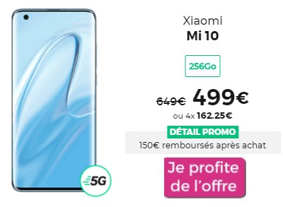 Le Xiaomi Mi 10 est en promo à 499€ au lieu de 649€ avec ou sans abonnement. En effet, vous pouvez soit l'acheter nu ou accompagné d'un forfait RED sans engagement à partir de 5€ par mois. Par ailleurs, RED vous offre la possibilité de payer votre nouveau Smartphone en 4 fois.