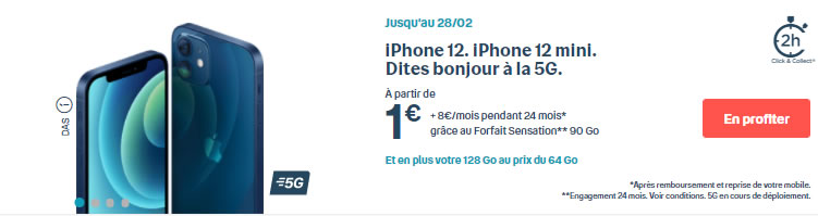 Pour sa part, l’iPhone 12 mini 128 Go (dont le prix sans forfait est de 829 €) vous coûtera seulement 1€ (+8€/mois) avec les conditions presque identiques. La seule différence, est qu’il vous faudra faire reprendre un Smartphone d’une valeur de 68,90€ pour faire tomber le tarif du Smartphone à 1€.