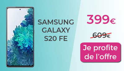 Chez l'opérateur 100% Web de SFR, vous pouvez acquérir pour seulement 399€ (au lieu de 609€) le superbe Samsung Galaxy S20FE d'une capacité de 128Go et de coloris bleu, rouge, vert, orange, blanc ou lavande au choix. Pour cela, cumulez les 2 promotions du moment à savoir une remise immédiate de 110€ sur le site de l'opérateur, puis un remboursement de 100€ effectué par le constructeur après achat.