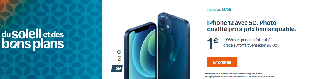 Jusqu’au 15 août 2021, vous pouvez acquérir l’iPhone 12 64 Go chez Bouygues Telecom pour seulement 193 € ou 1 € + 8 € par mois pendant deux ans. Comment bénéficier de ce prix exceptionnel ? En commençant par souscrire au forfait Sensation 90 Go avec Avantages Smartphone de l’opérateur ! Effectivement, en prenant cet abonnement maxi data, vous aurez le droit à un tarif préférentiel sur le mobile d’Apple.