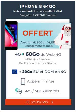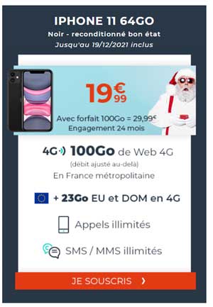 - un iPhone 11 à 19,99 € + un abonnement mobile 100 Go à 29,99 € mensuels.