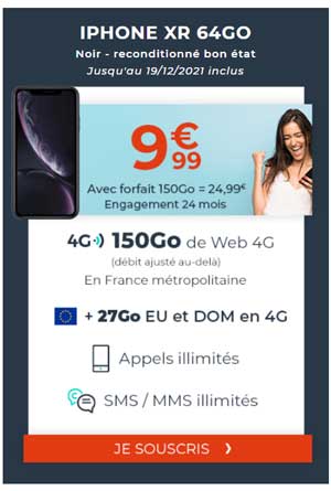 - un iPhone XR à 9,99 € + un abonnement mobile 150 Go à 24,99 € mensuels ;