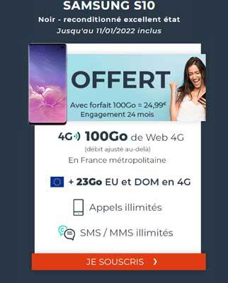 Le premier pack promotionnel proposé par Cdiscount Mobile permet d’obtenir gratuitement un Samsung Galaxy S10 pour la souscription à un forfait 100 Go. Le smartphone offert est un appareil reconditionné en excellent état. Il s’agit du modèle noir.